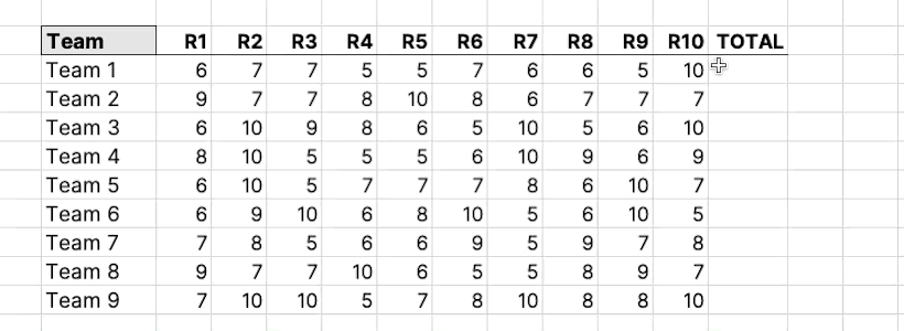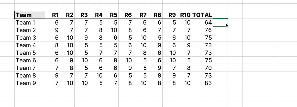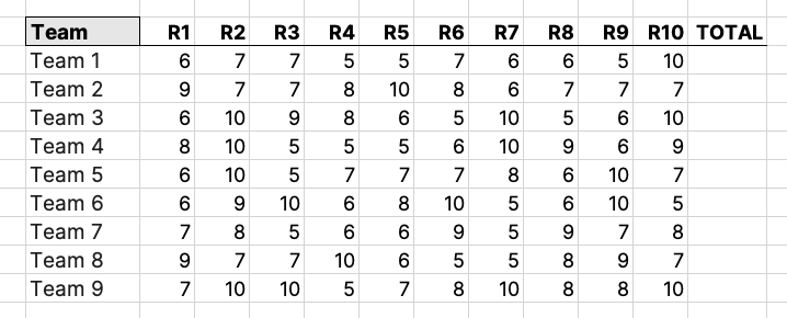 You want to add up the total scores for each team, and you probably know how to do this.