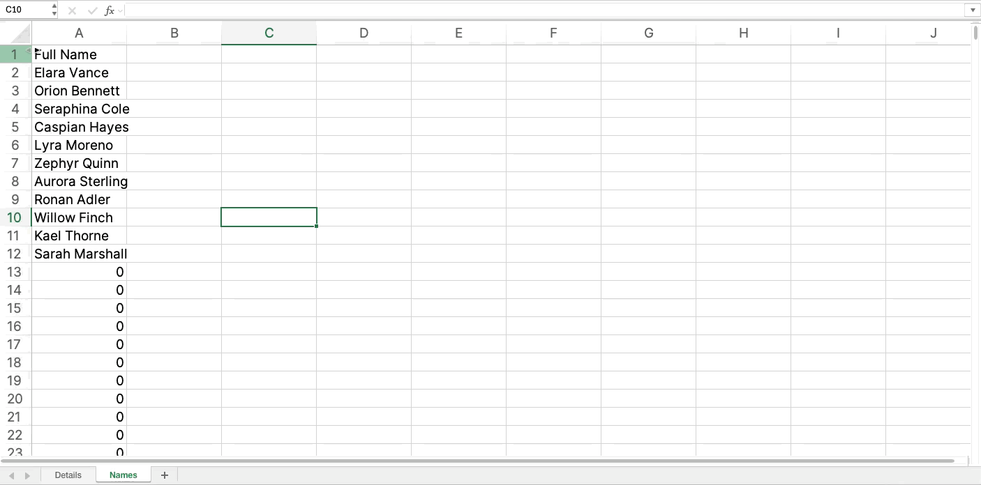 This is a great trick, but it’s not pretty. It brings the names with zeros because Excel is saying, “I’ve brought you everything you asked for, and the zeros mean there’s nothing in the cells below the names.”