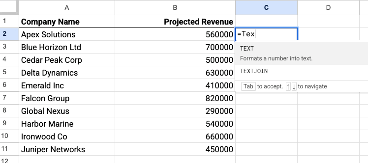 If you want to, say, build a graph and the revenue numbers are a bit too long, you can change the revenue from “560,000” to “560K” using the pluripotent TEXT function: