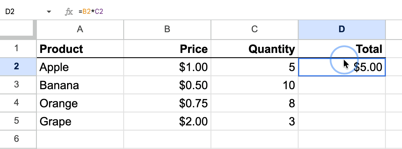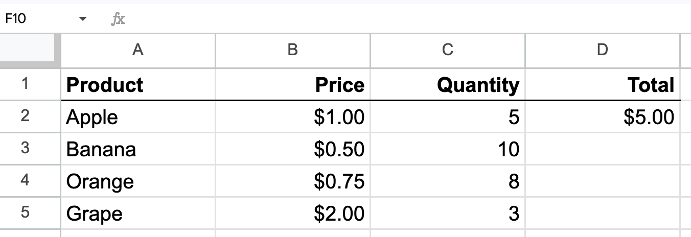 You want to copy the formula used to compute the first total ($5) downwards. Now there are multiple ways to do this, and formatting the data as a table would completely render this exercise redundant, but options are nice.