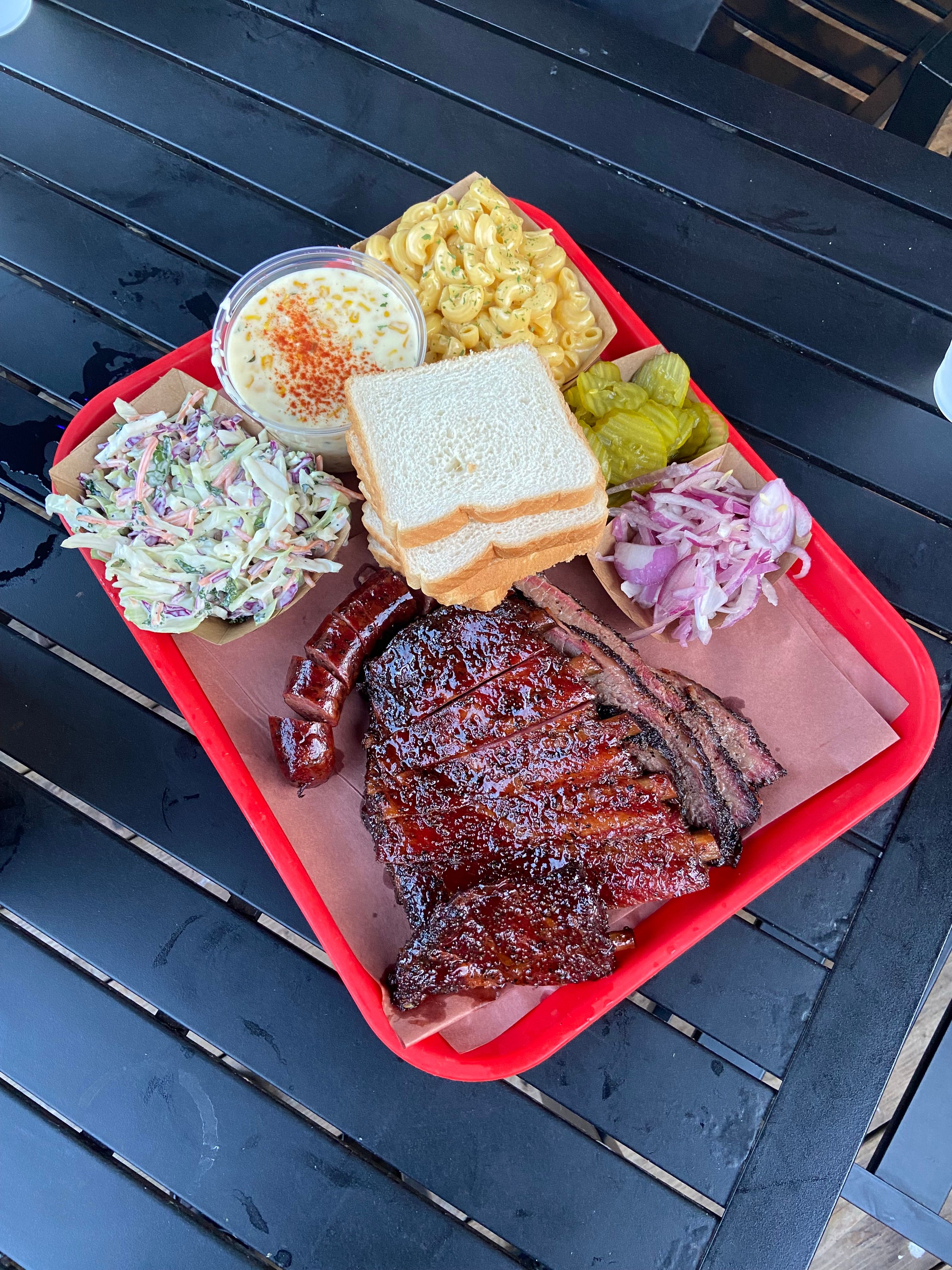Here’s how it’s done: You grab two slices of bread (must be white, none of that whole wheat nonsense), and use them to make a sandwich with brisket (the layers of meat peeking from under the ribs) as the base, followed by the coleslaw, pickles, onions, and a generous lathering of the provided barbecue sauce).