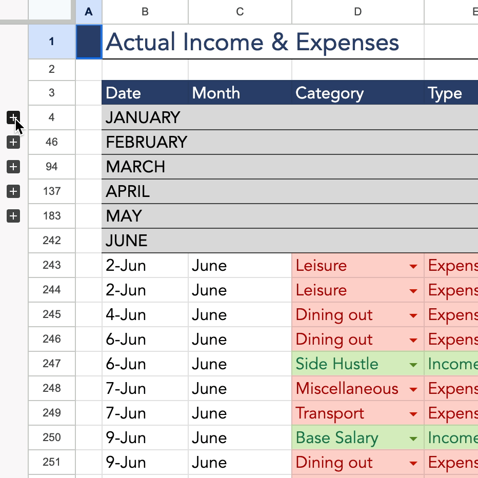 In Google Sheets, you can group rows or columns and make them appear or disappear at a click of a button.