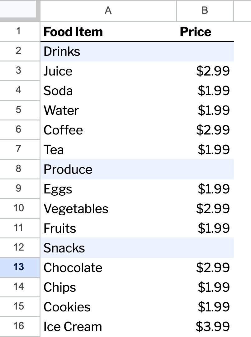 1. The data is a grocery list organized by categories (The categories are highlighted in light blue)