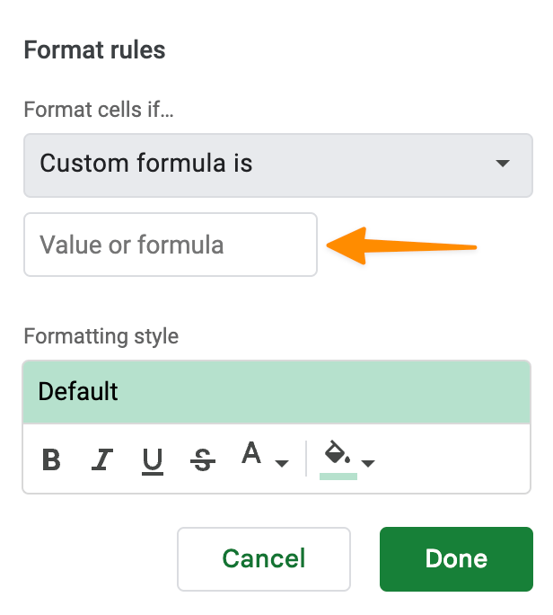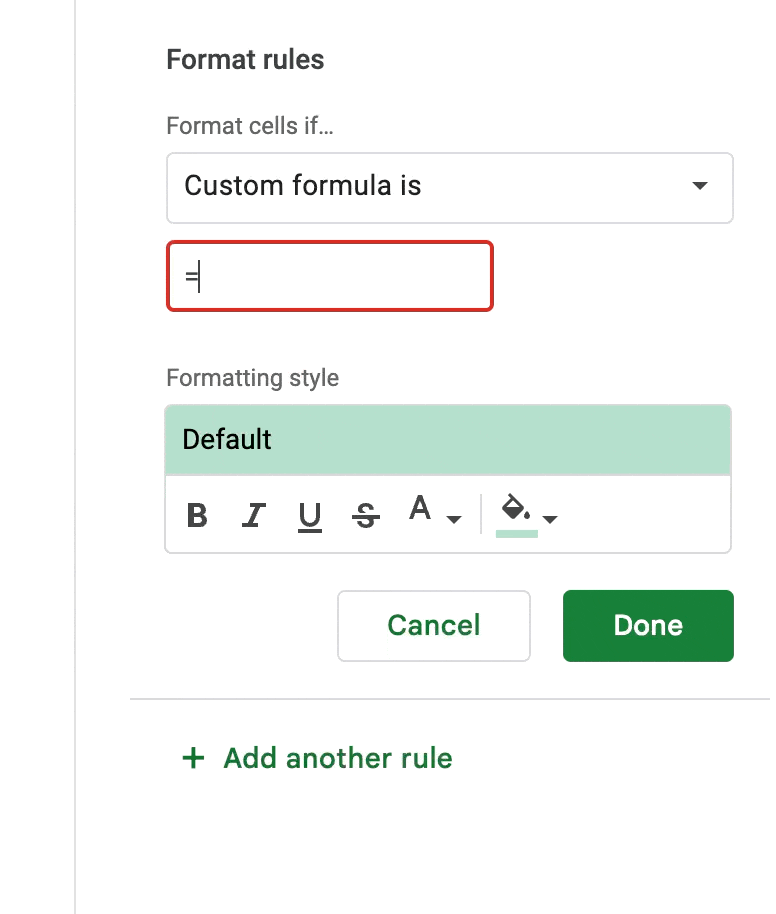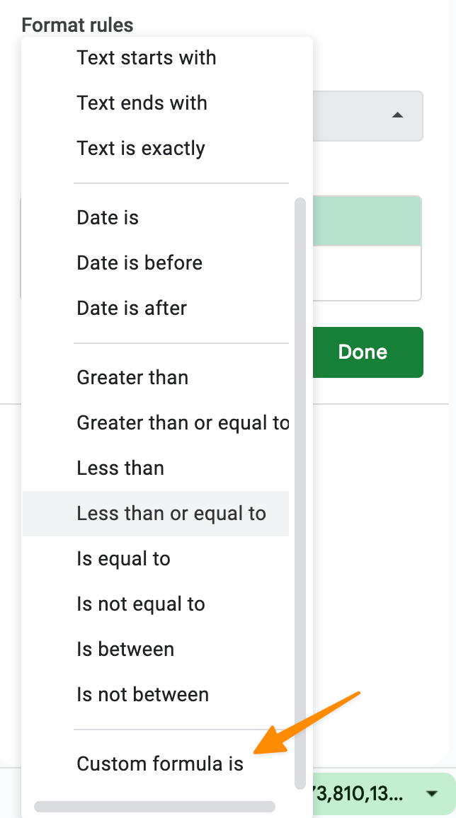 3. Under Conditional format rules, go to Format rules, and select Custom formula is from the dropdown