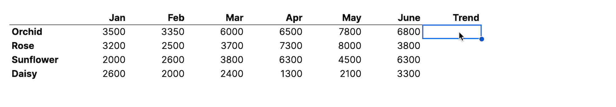 3. In the first cell in the Trend column corresponding to the Orchid flower variety, enter the SPARKLINE function: