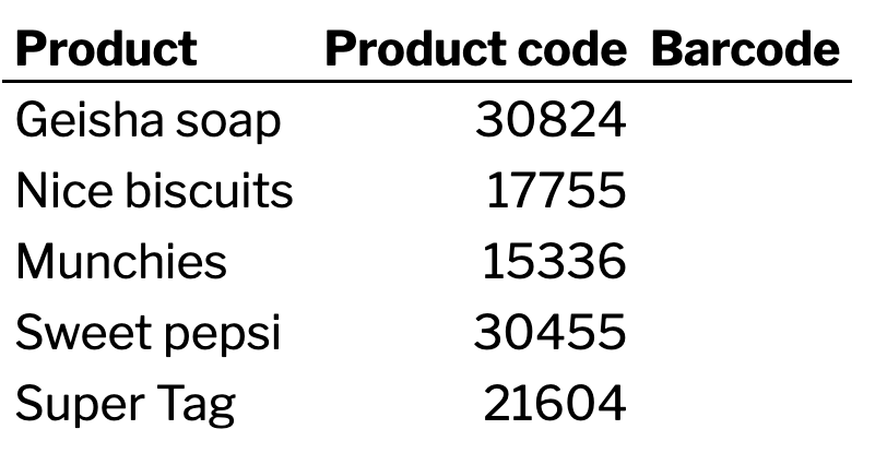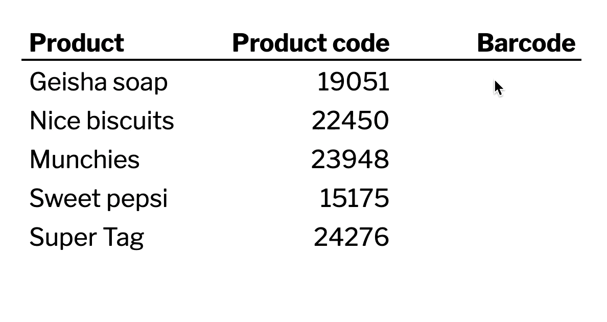 To get barcodes for each product, type the following formula into the first cell in the “barcode” column, corresponding to the “Geisha soap” product.