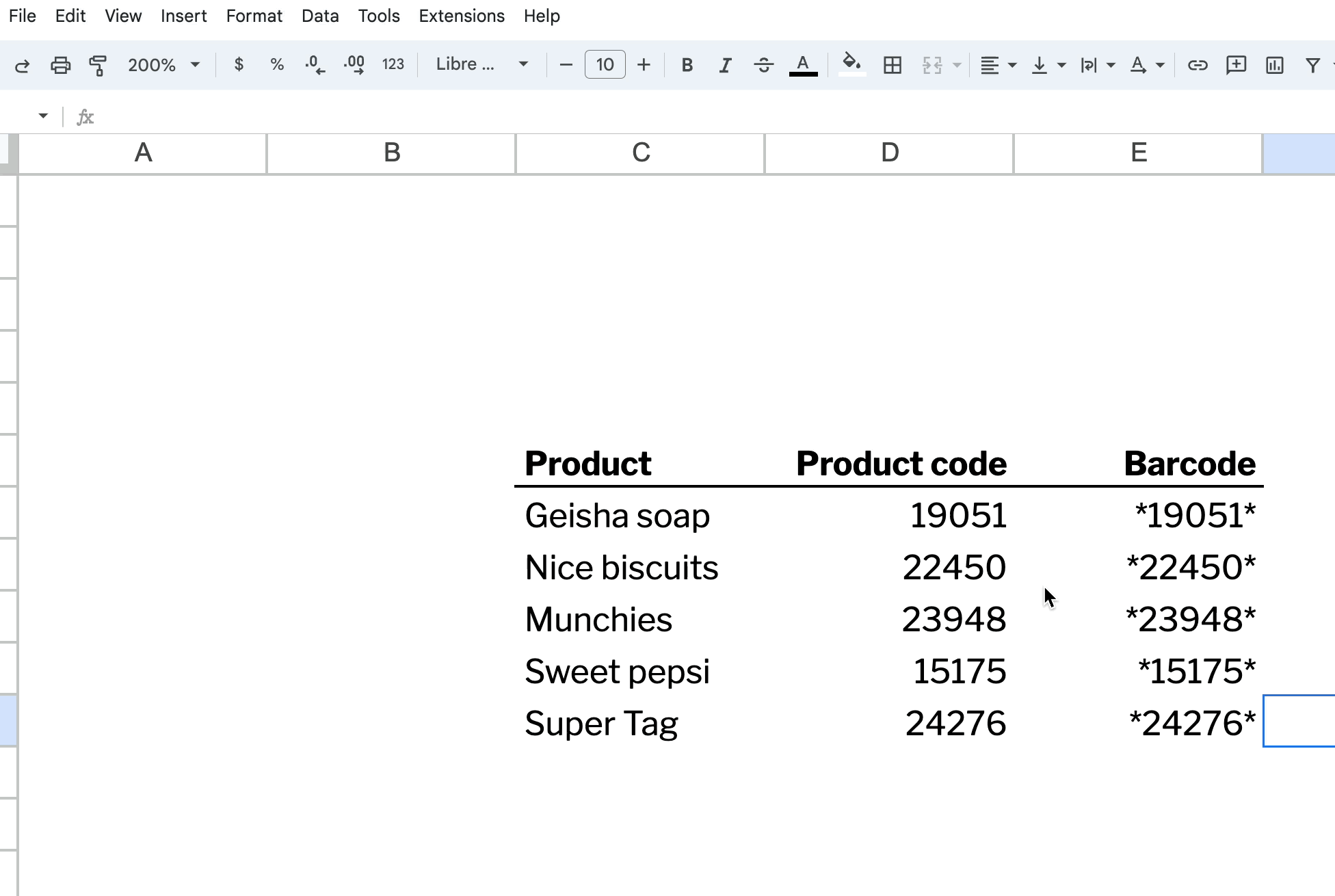 Select all the new values in the Barcode column, and change the font to “Libre Barcode 39”.